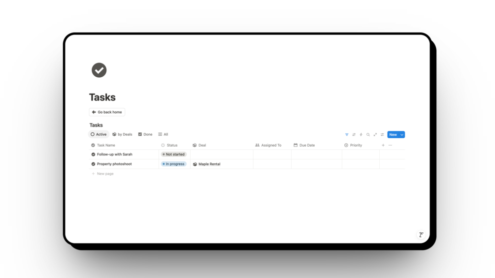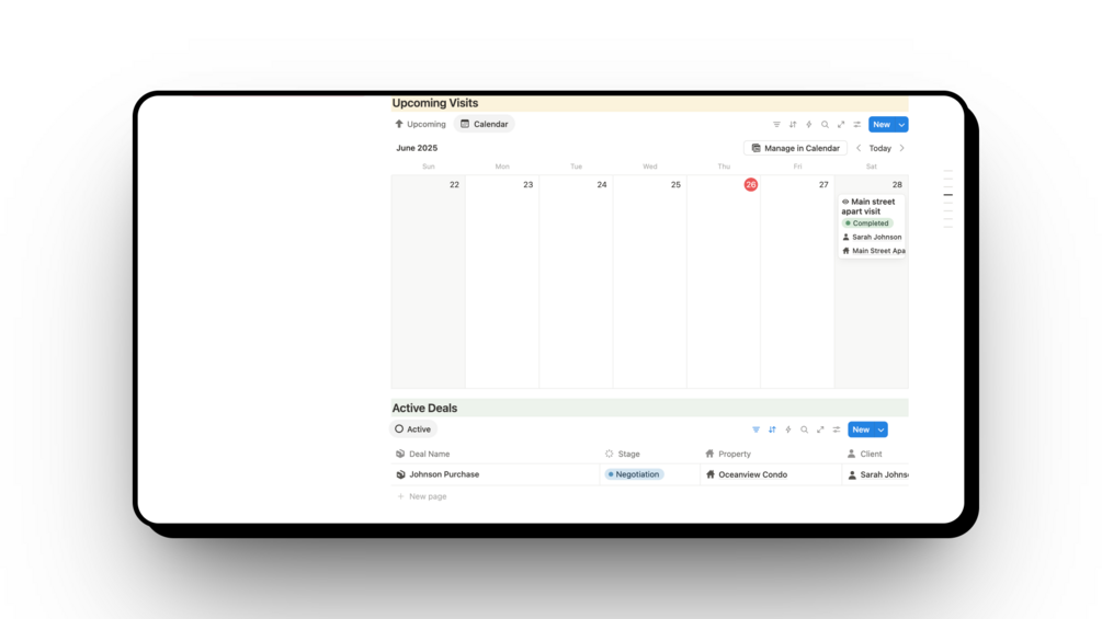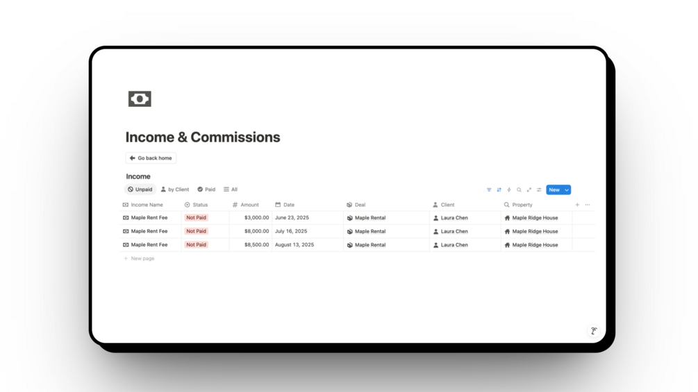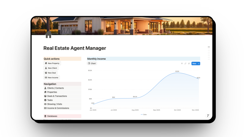 A clean, all-in-one Notion template to manage your properties, clients, deals, tasks, showings, and commissions. Perfect for solo agents and brokers who want to stay organized and close more deals — all from one simple dashboard.