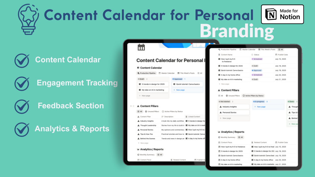 Ready to build a consistent and impactful online presence? The Content Calendar for Personal Branding is a free Notion template that helps you do just that. Designed for creators, professionals, and entrepreneurs, this easy-to-use template allows you to organize your content strategy by theme, platform, and status.