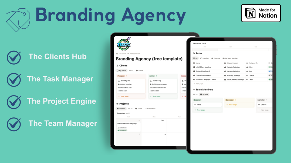 Free Branding Agency template for Notion to manage clients, projects, tasks, and team members simply. Ideal for small teams and freelancers who want an easy, organized system to track agency workflow without complexity or clutter.